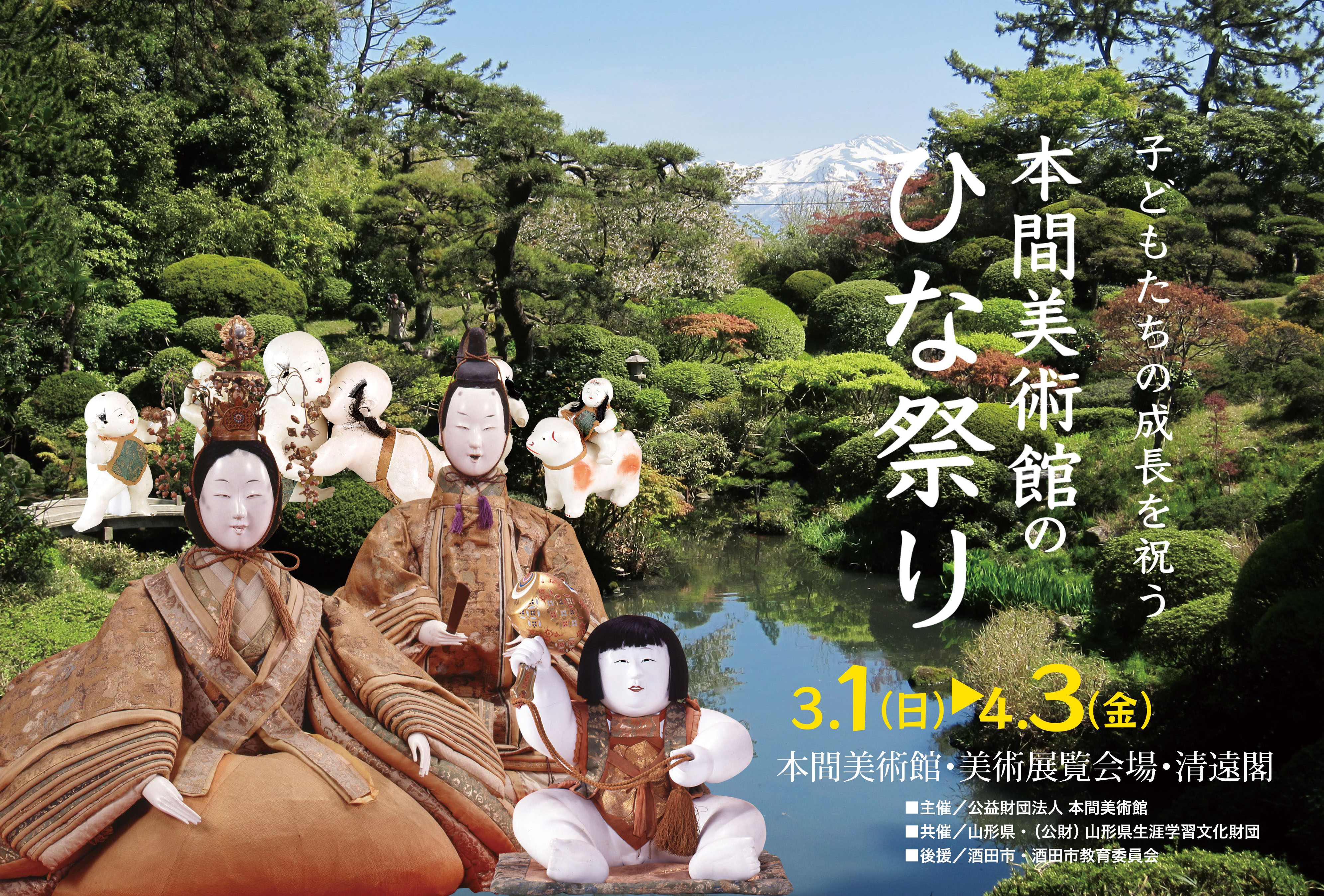 北前船がもたらした京文化を代表する雛人形や御所人形は、湊町で栄えた酒田が全国に誇る宝です。昭和23年からつづく本間美術館のひな祭りでは、鶴岡の実業家・斎藤昌二氏が蒐集された京雛や御所人形、衣装人形など(白巽文庫コレクション)を中心に、庄内の名家・風間家や、白崎家に伝来した雛壇飾りなど、貴重な古典人形をご紹介します。