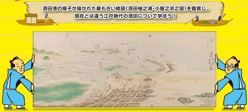 秋の芸術鑑賞イベントとして鑑賞プログラム「江戸時代の酒田へタイムスリップ」を行います。江戸時代の酒田の港付近の様子を描いたものとしては最も古い絵図とされる《酒田袖之浦・小屋之浜之図》(複製)を鑑賞し、当時の北前船で繁栄した酒田について学んでみましょう。難しい内容ではなく、小学生から大人の方まで気軽に参加いただける内容です。ぜひお越しください!