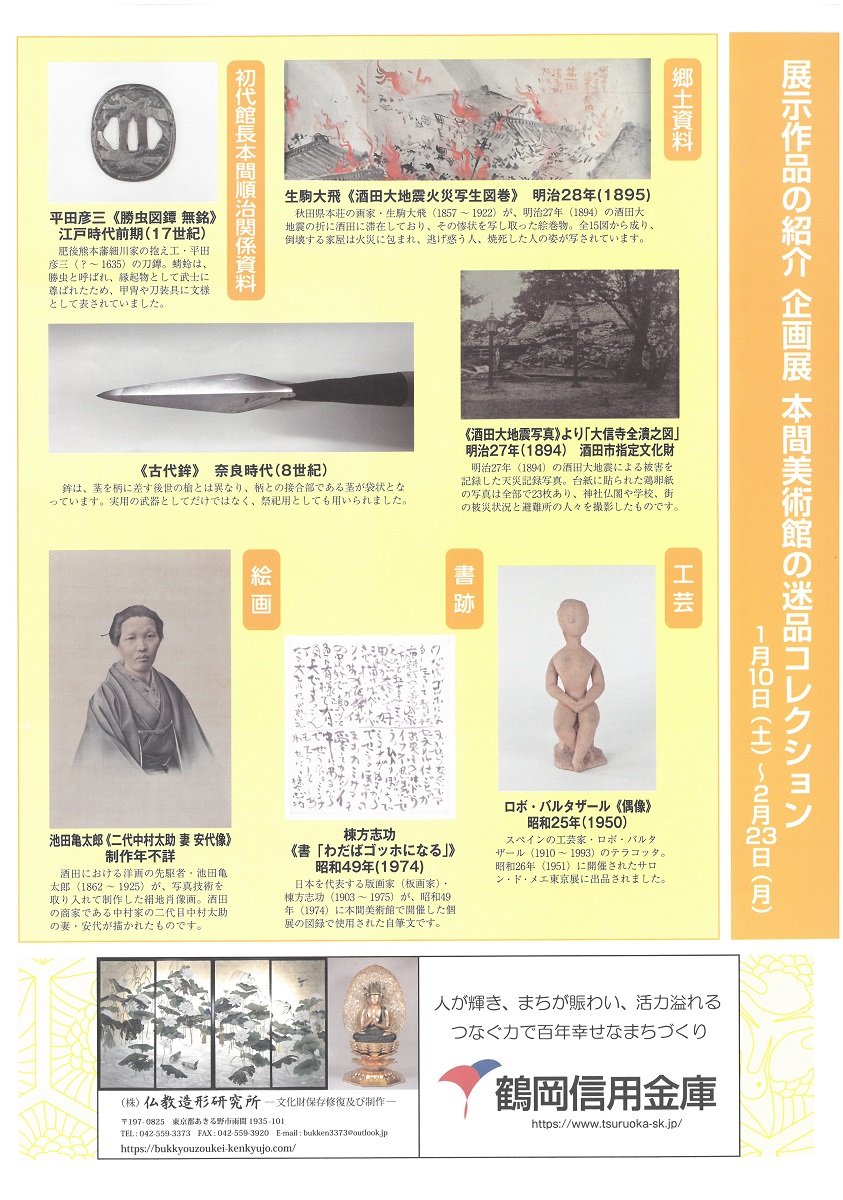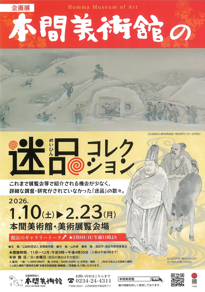 昭和22年(1947)に開館した本間美術館には、本間家をはじめ、美術コレクターや作家、市民からの寄贈、美術館活動における収集によって収蔵された美術工芸品があります。それらの中には、芸術的・歴史的にも価値の高い「名品」とされる作品もありますが、これまで展覧会等で紹介される機会が少なく、詳細な調査・研究がされていなかった「迷品」とされる作品もあります。