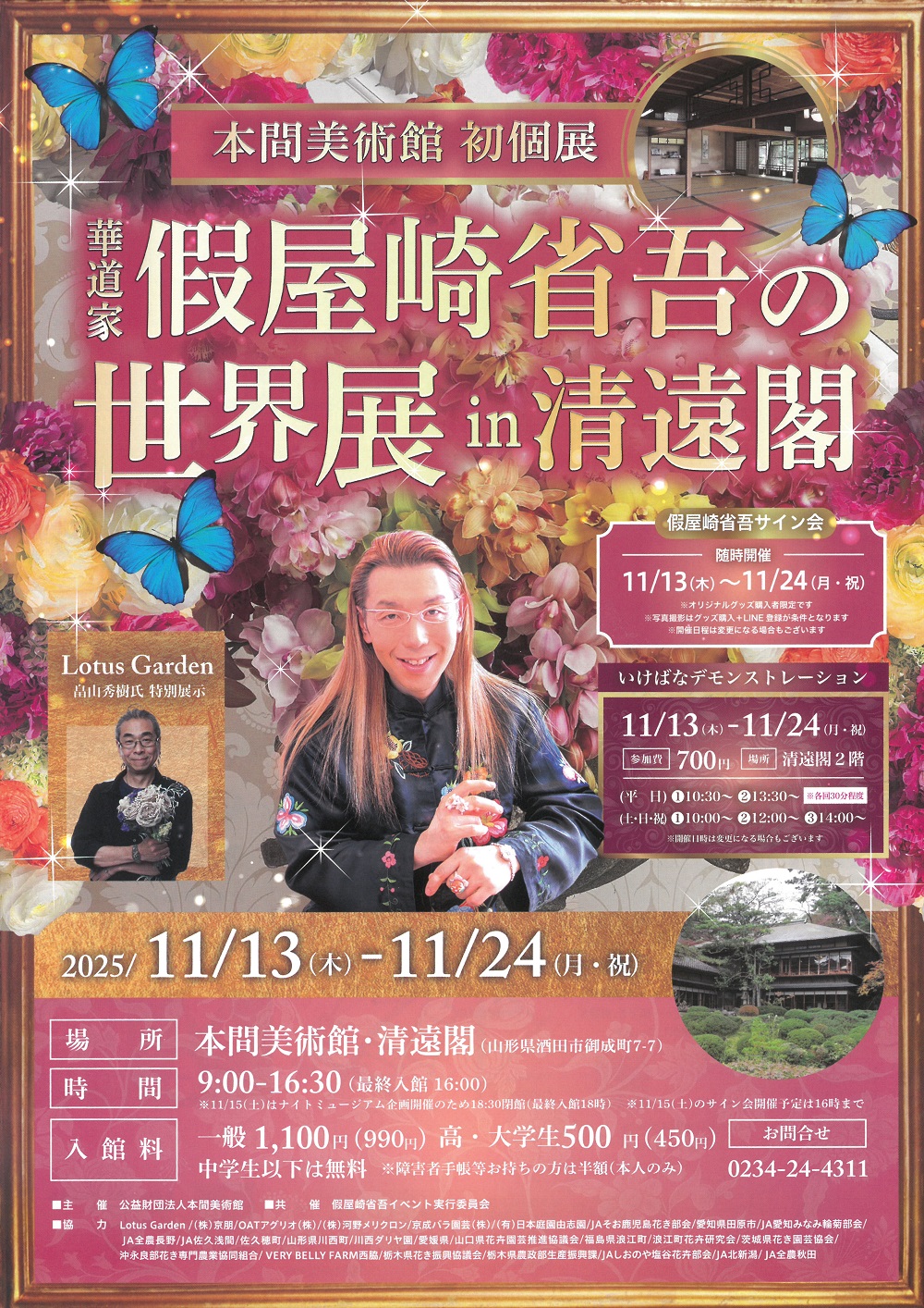華道歴40周年を迎えた元祖華道家 假屋崎省吾氏による本間美術館・清遠閣義での初個展です。假屋崎氏のいけばな作品と、藩主酒井侯の休憩所、その後、酒田の迎賓館として使用された築212年の精微な京風木造建築の「清遠閣」との優美秀麗なコラボレーションとなる美の世界がお楽しみいただけます。また、Loutus Garden主宰のフローリスト・畠山秀樹氏による特別展示もご覧になれます。会期中には、サイン会(グッズ購入者限定)、いけばなデモンストレーション(別途参加費)も開催致しますので、ぜひお越し下さい。