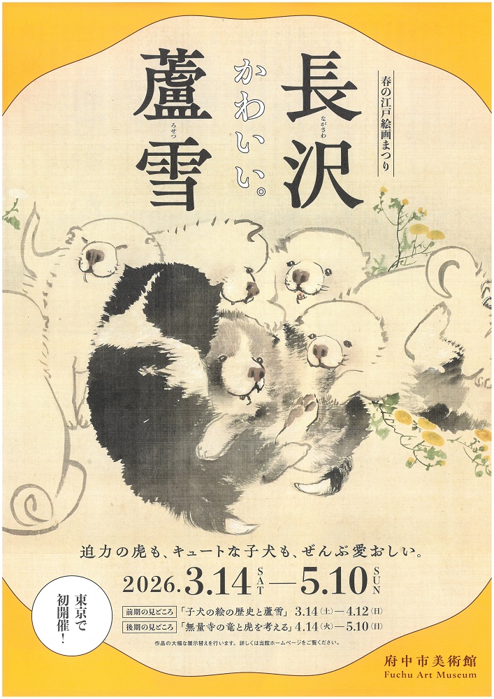 3月14日(土)から府中市美術館(東京)で開催される展覧会「春の江戸絵画まつり 長沢蘆雪」(5/11まで)に、当館所蔵の「狗児図扇面」(前期展示・3/14~4/12)と「四睡図」(後期展示・4/14~5/10)が出品されます。東京では初開催となる蘆雪展となりますので、ぜひご覧ください。
